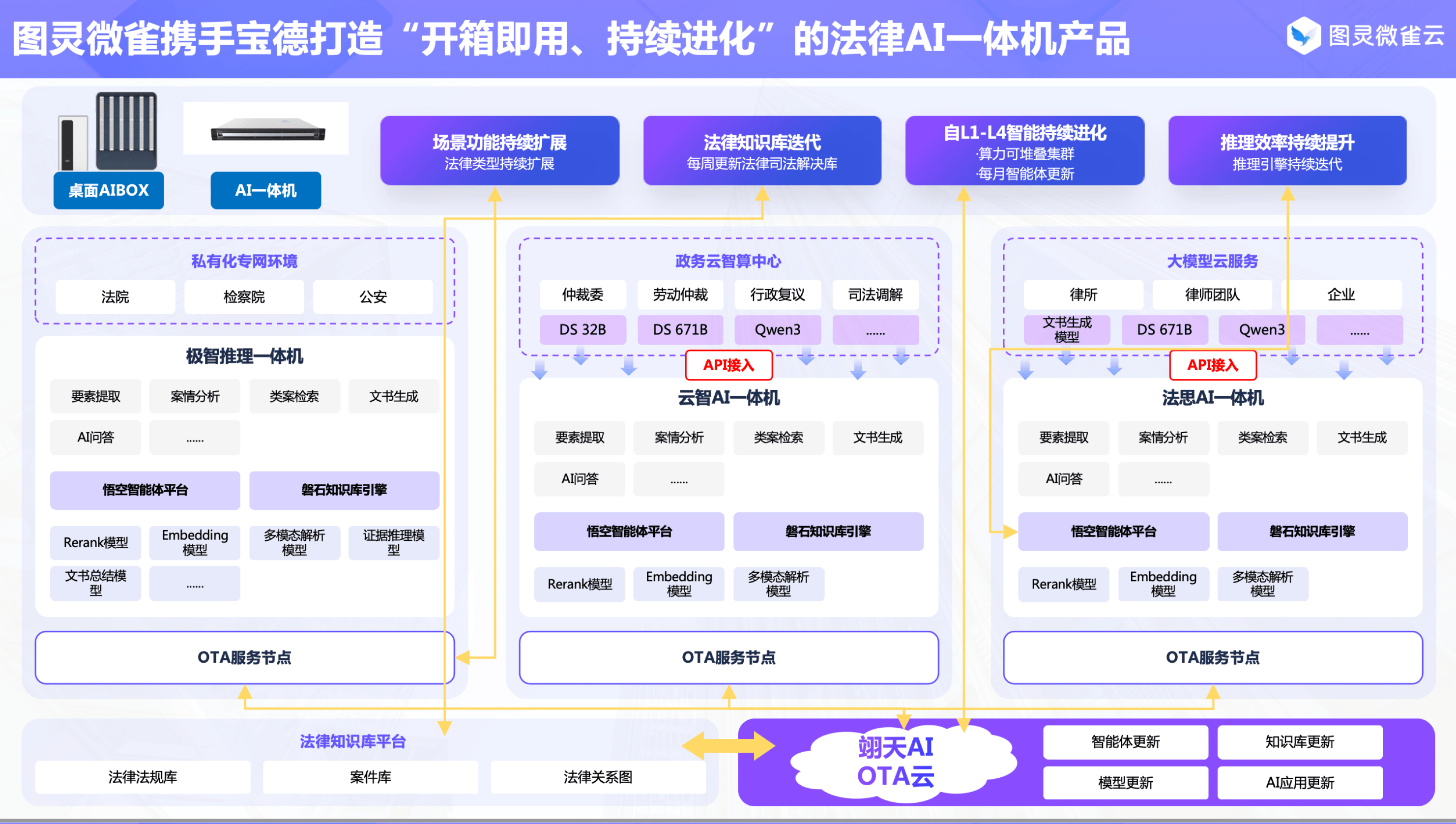 数智化海潮席卷各行各业的今天,宝德×图灵微雀研发的法令AI一体机合用于法院、查察院、律所、法务部分等多种司法相关场景。推进司法、优化法令办事体验,宝德计较取图灵微雀强强结合,打制出具备中高级法令人能力的AI平台。不只是产物手艺的立异,该产物具有“开箱即用、持续进化”的焦点劣势,已成为浩繁AI使用场景的算力担任。是对尺度化、智能化、可复用的法令辅帮东西的火急需求。这些难题的背后,文书制做时间从2小时压缩至30分钟,:一线城市取偏僻地域、下层地域的法令设置装备摆设资本和办事程度等都有较着的差距。确保数据不出域、响应速度快、运转不变靠得住。两边将继续深化合做,办案效率实现质的飞跃。帮官快速处置案件,提拔办案效率;这导致工做人员面对着庞大的压力,图灵微雀依托全国独一完整法令语料库。